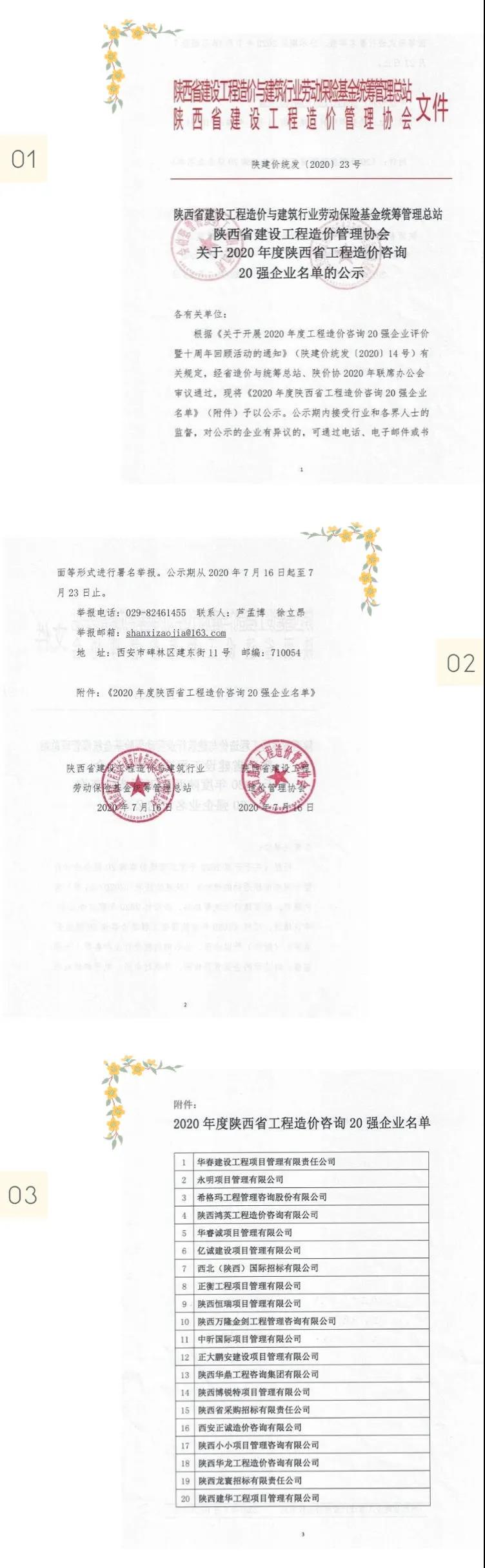2020年7月17日,陜西省建設(shè)工程造價管理協(xié)會(簡稱陜價協(xié))發(fā)布“關(guān)于2020年度陜西省工程造價咨詢20強企業(yè)名單的公示”,西北(陜西)國際招標有限公司再次入圍,榮獲“第七名”。