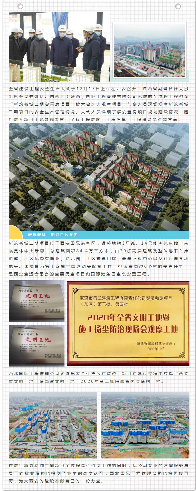 我公司承接全過程工程咨詢“新筑新城二期安置房項目”被全省建設(shè)工程安全生產(chǎn)大會選為觀摩項目,陜西省副省長徐大彤蒞臨參觀考察
