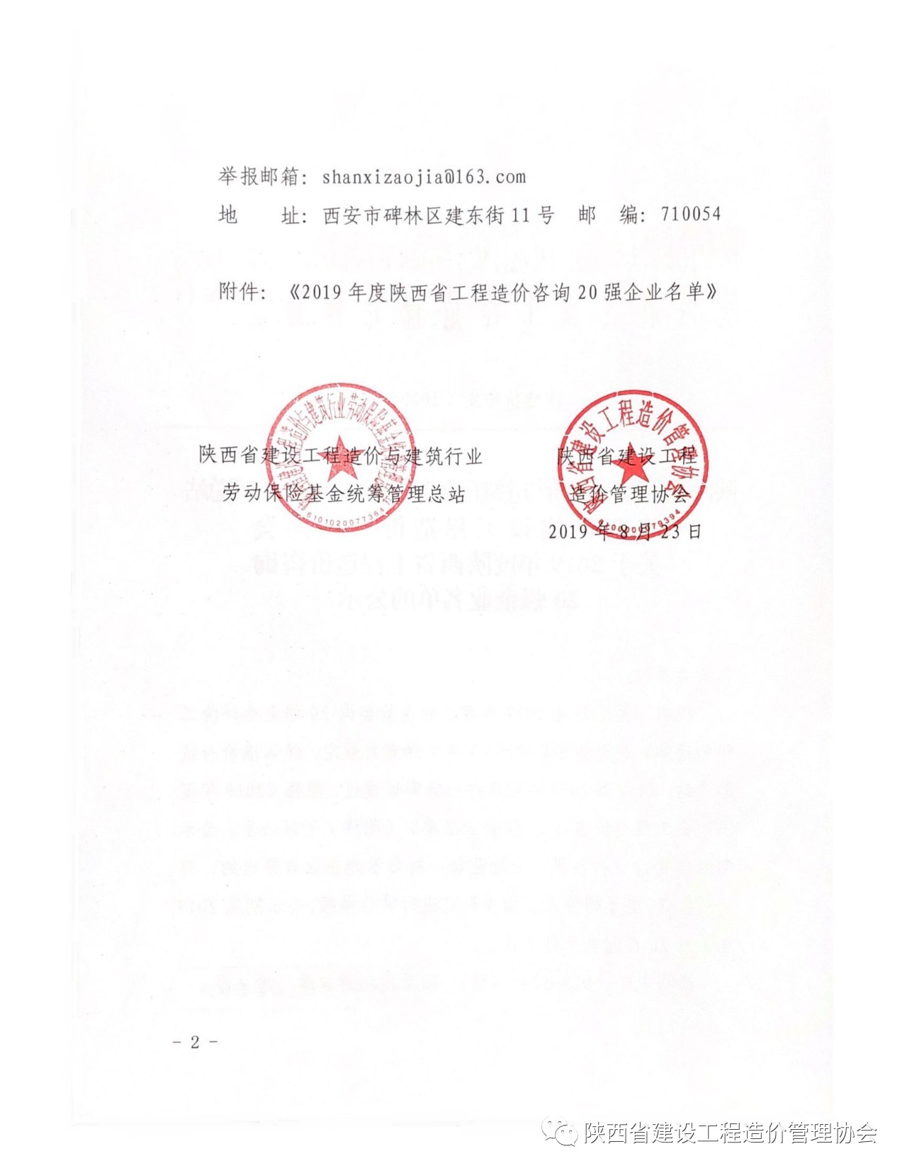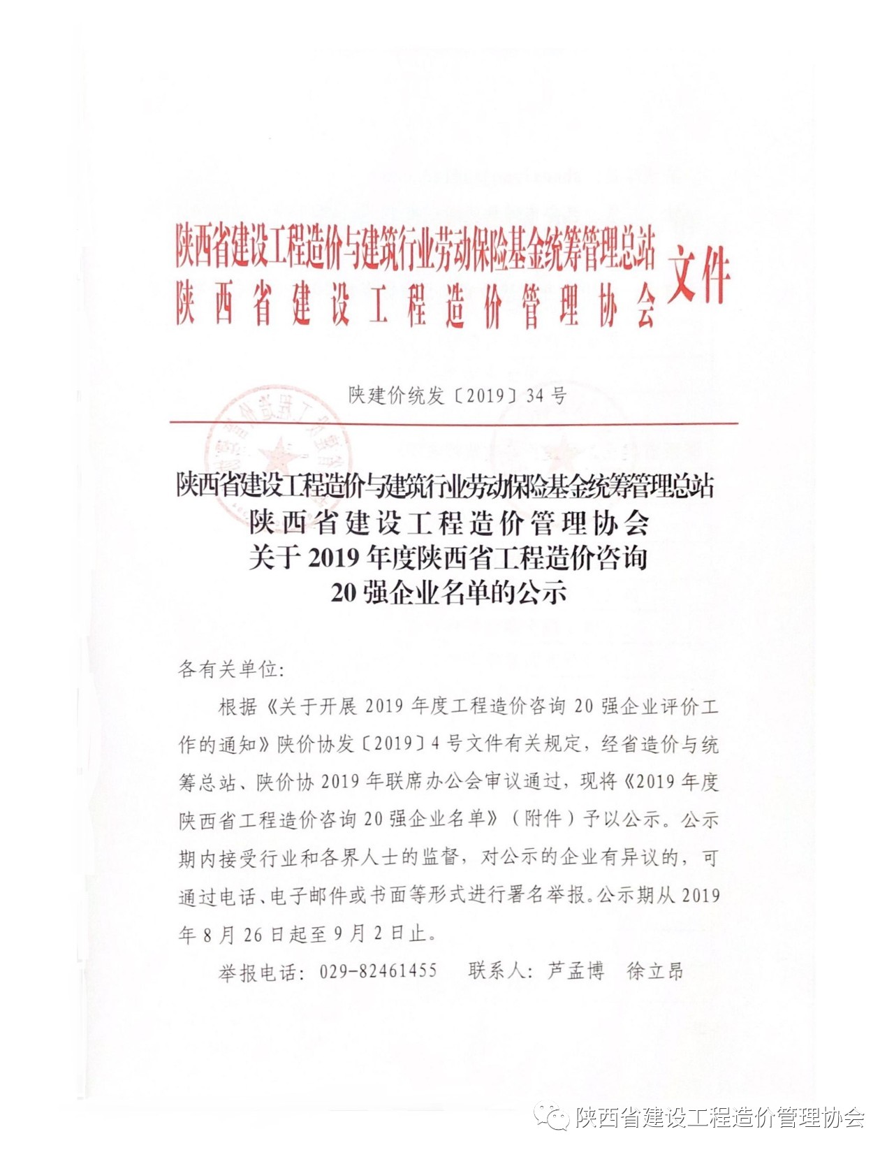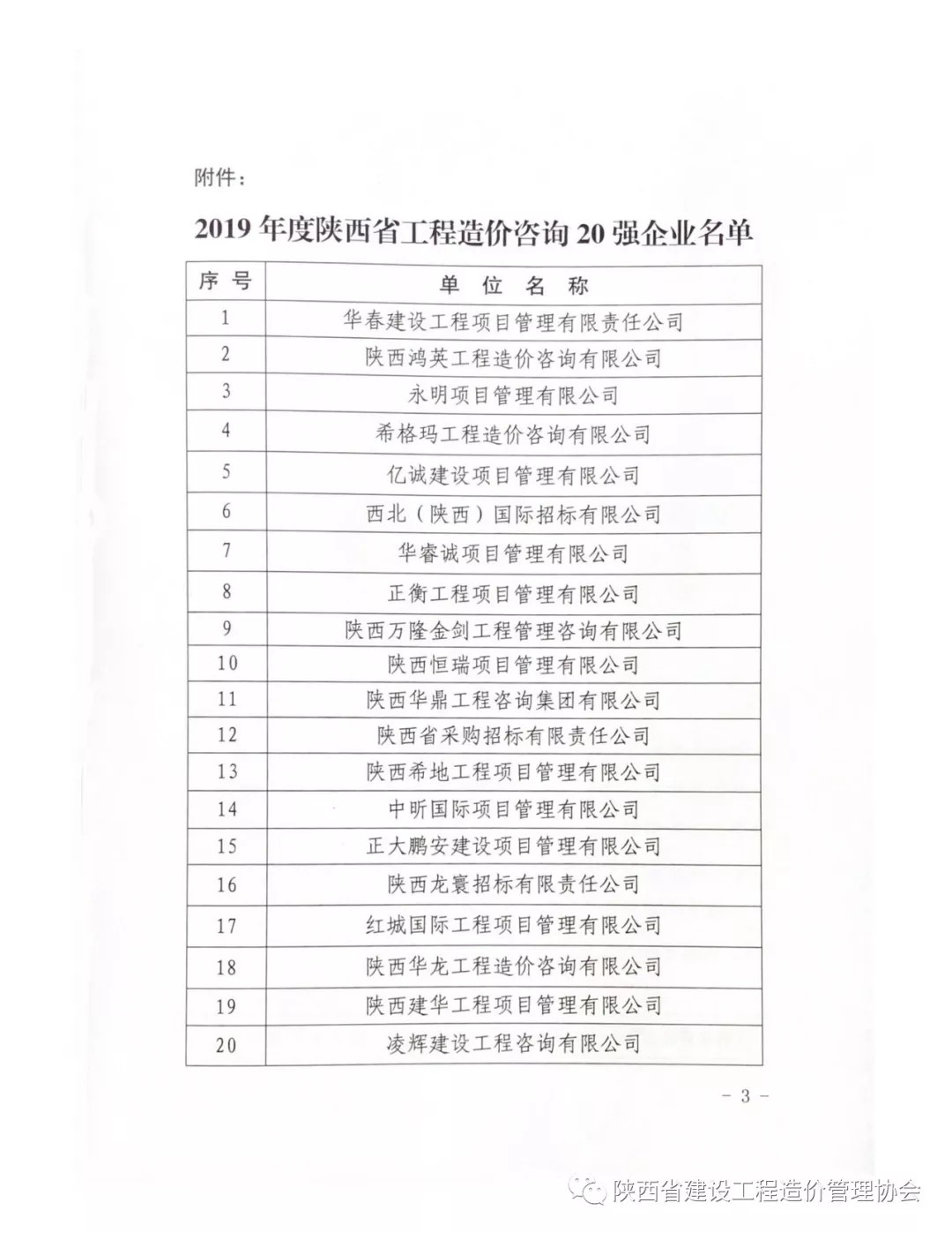 2019年8月26日,陜西省建設(shè)工程造價(jià)管理協(xié)會(huì)(簡(jiǎn)稱陜價(jià)協(xié))發(fā)布“關(guān)于2019年度陜西省工程造價(jià)咨詢20強(qiáng)企業(yè)名單”公示,西北(陜西)國(guó)際招標(biāo)有限公司再次入圍,榮獲“第六名”。