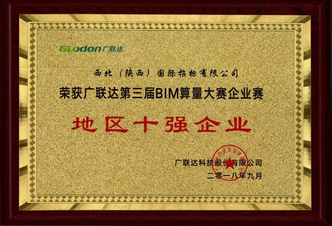 祝賀我公司榮獲廣聯(lián)達第三屆BIM算量大賽企業(yè)賽 地區(qū)十強企業(yè)