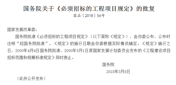 國務(wù)院批復(fù)《必須招標(biāo)的工程項(xiàng)目規(guī)定》6月1日起實(shí)施